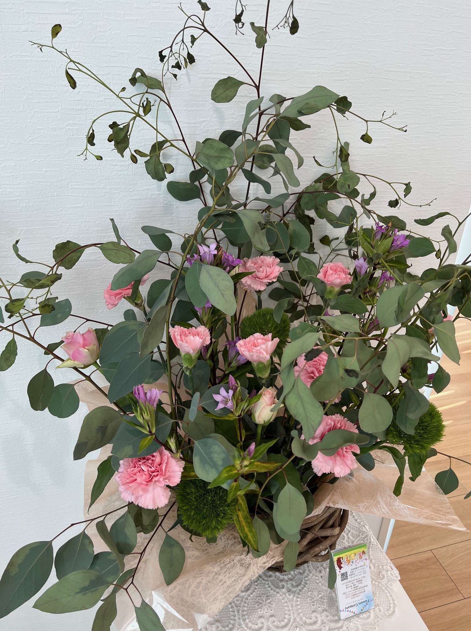 ピンクの花の優しさと、ユーカリの落ち着いた緑が絶妙なバランスで調和していて、見ているだけで心が穏やかになります😺